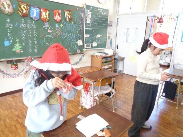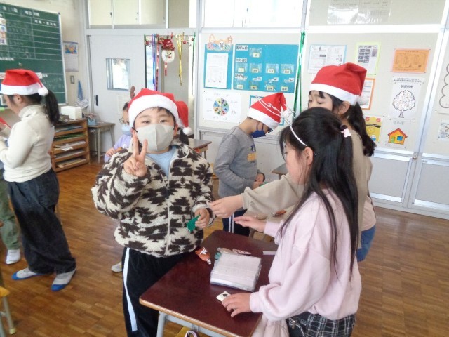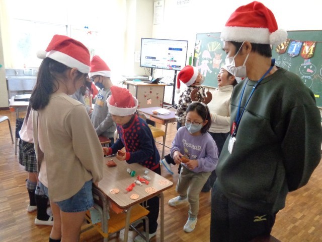 クリスマスツリーの飾りに使った形と色を、友達に説明しています。