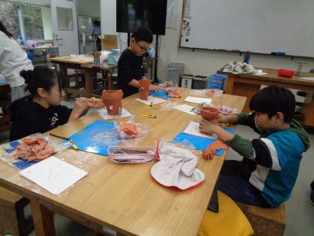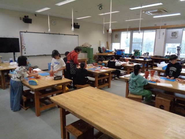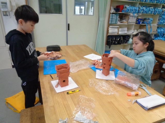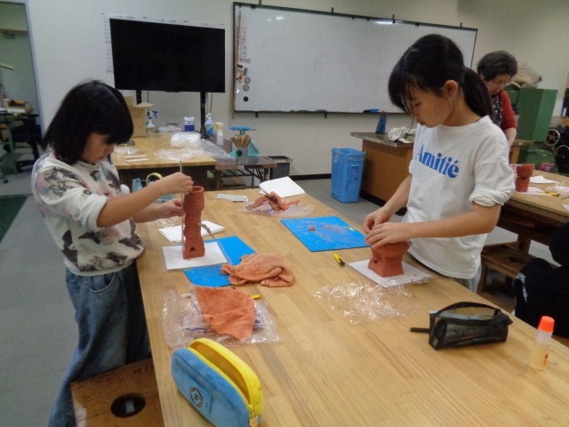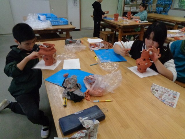 粘土を使い、手びねりの紐作りで壺のような立体を作っています。