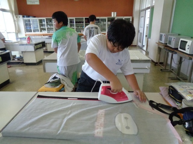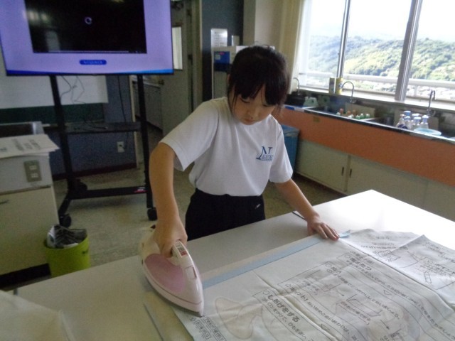 今日は、わきを三つ折りにしてアイロンをかけ、まち針をうちました。