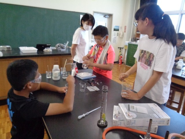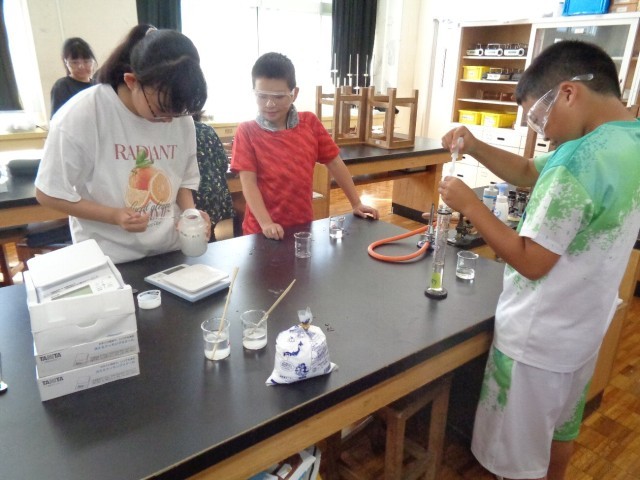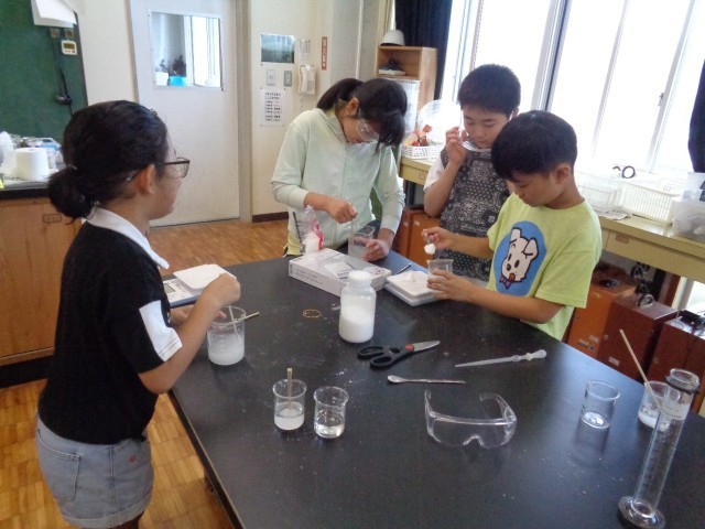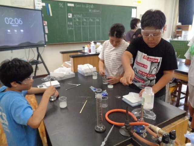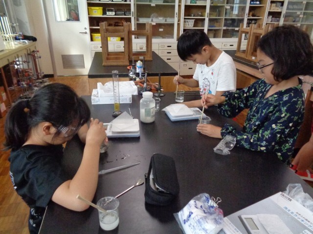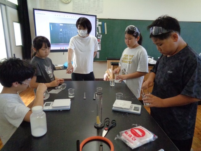 電子天秤を使って少しずつミョウバンや食塩を量り取り、とけ残りのないようにかきまぜながら様子を観察しています。