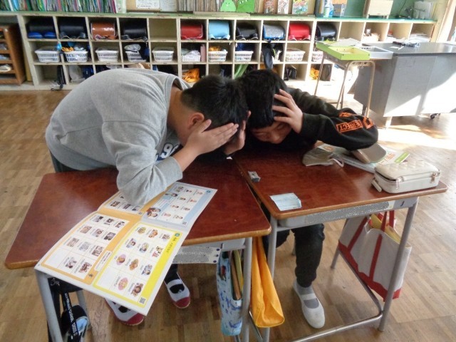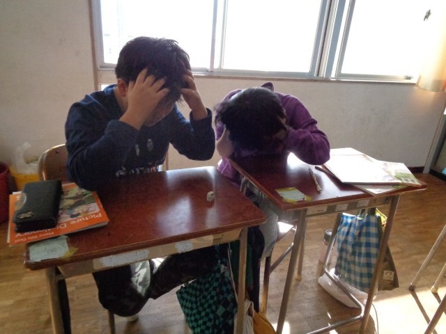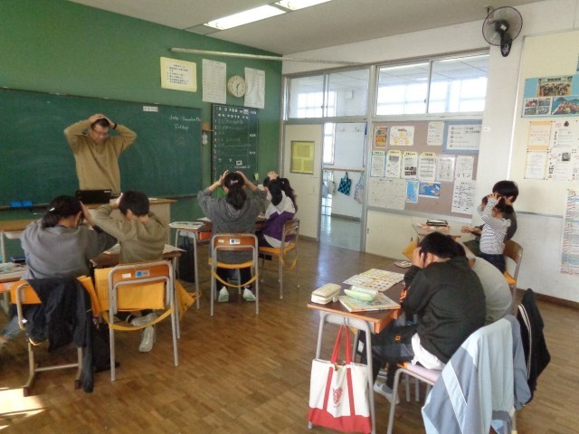 英単語を聞いて意味を答え、決められたワードが出たら机の上の消しゴムを取るゲームをしています。
