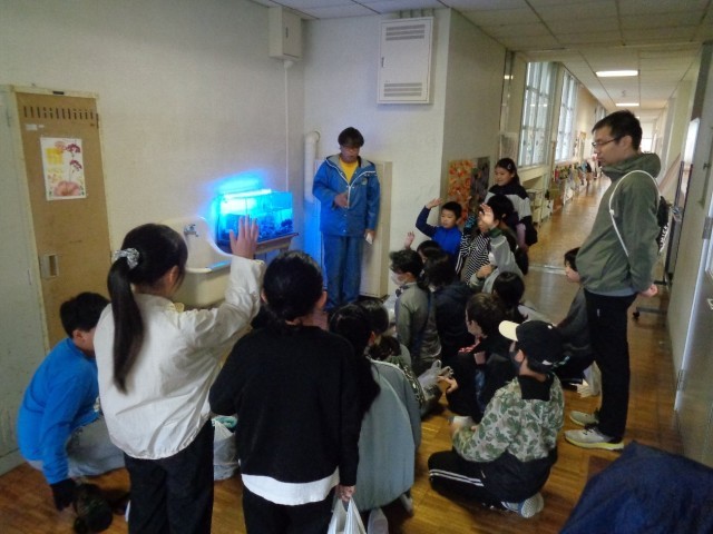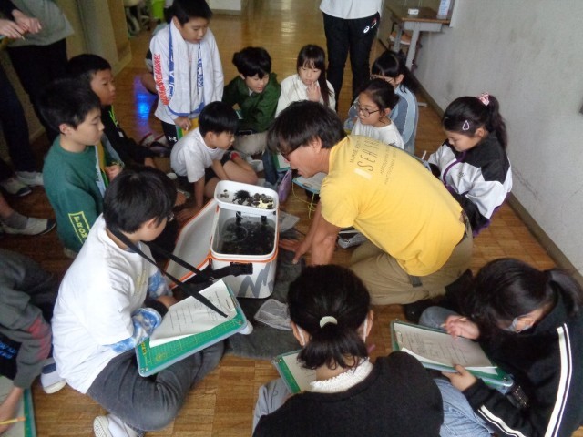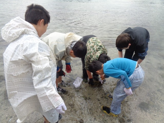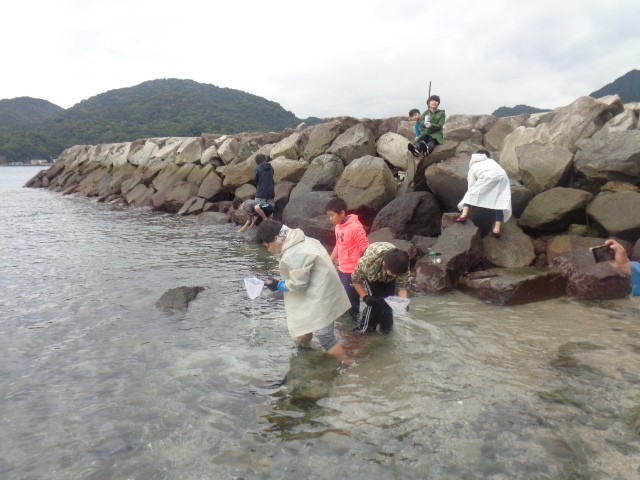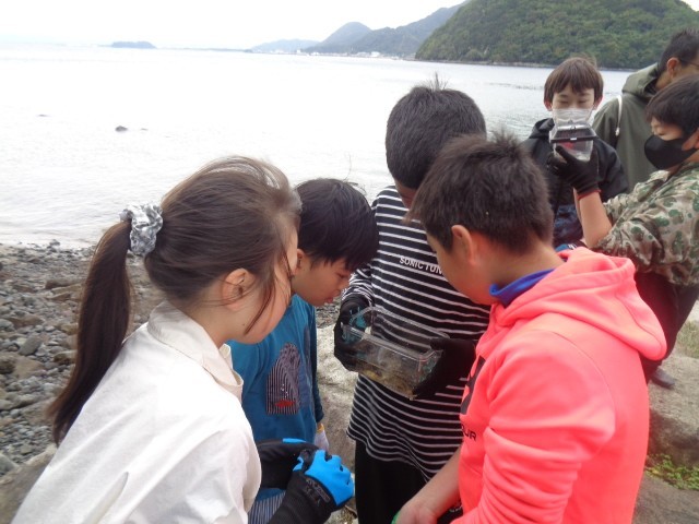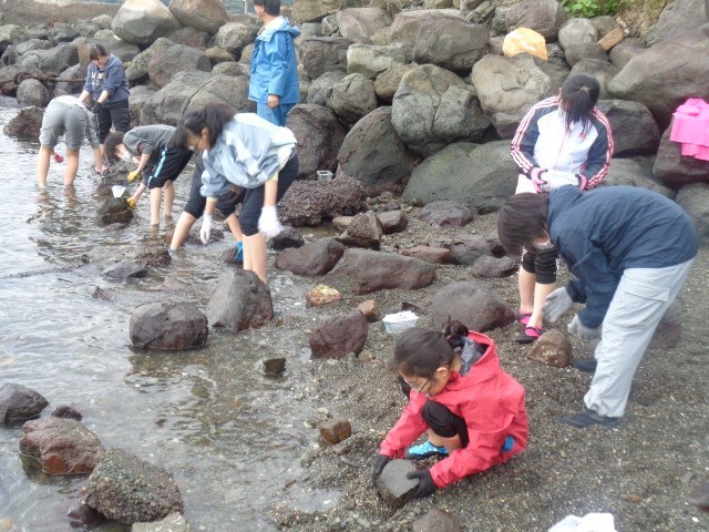 そこで、5・6年生が学校近くの磯に行き、貝やカニをなどつかまえてきました。