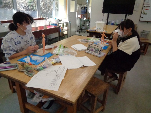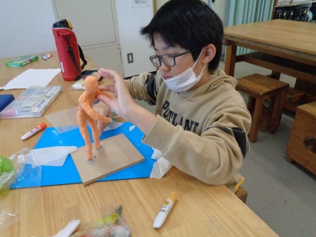 先週、真の針金を曲げてポーズをきめた骨組に、紙粘土で肉付けをしました。