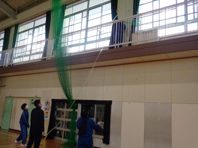 体育館の飾り付けを担当するグループは、看板や万国旗を設置する場所や方法を確認していました。