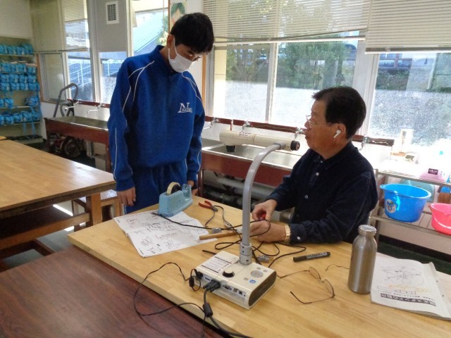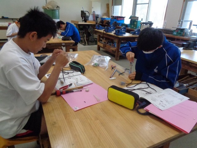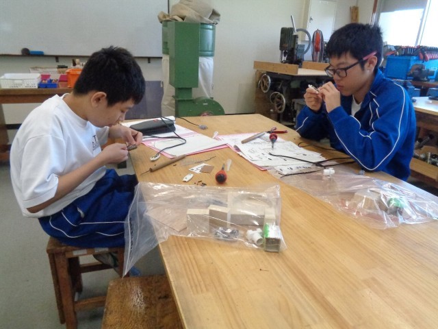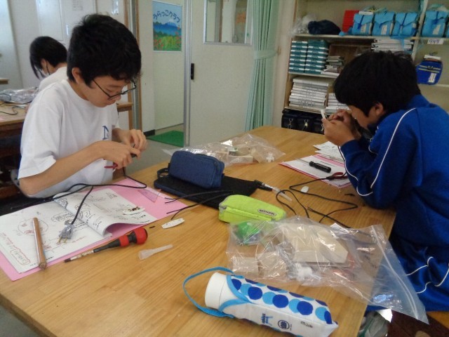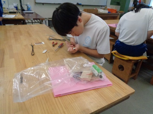 ニッパーを使って配線の皮膜を剥がす作業は力加減が難しく、慎重に作業していました。