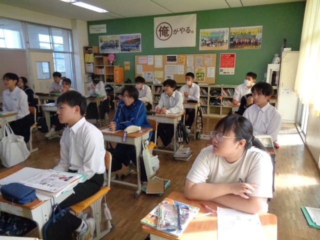 長年、この地域の防災に関わり、学校で防災教育の授業をされている方が来校し、生徒たちにどのような視点で地域防災について考えていったらよいか、お話をしてくださいました。