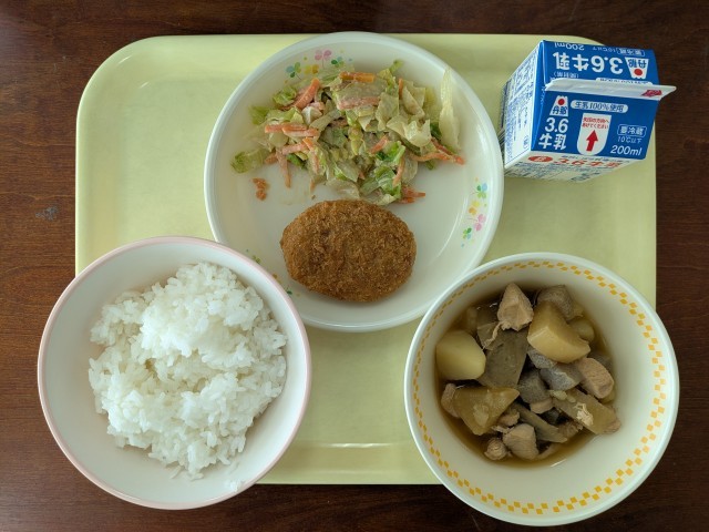 本日の給食は、ごはん、牛乳、とり肉のおちゃめ揚げ、さつまあげとキャベツの炒めもの、けんちん汁です。