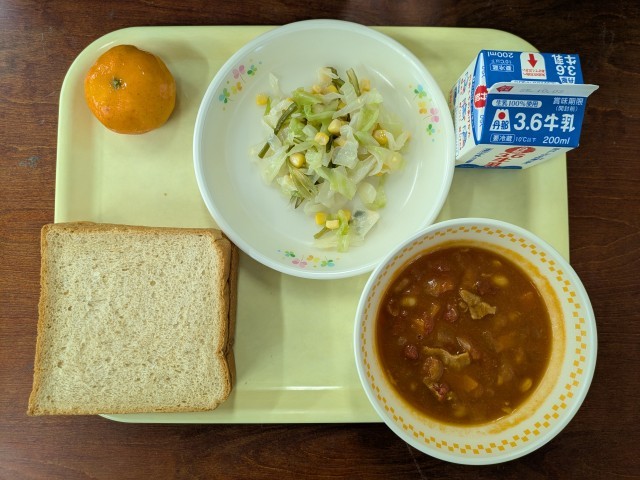 本日の給食は、黒糖食パン、牛乳、ポークビーンズ、茎わかめのサラダ、冷凍みかんです。