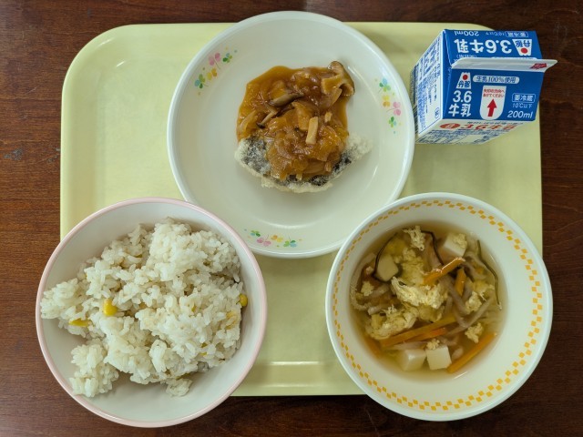 本日の給食は、トウモロコシごはん、牛乳、ホキのチリソース、たまごスープです。