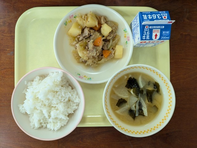 本日の給食は、ごはん、牛乳、肉じゃが、豆腐と大根のみそ汁です。