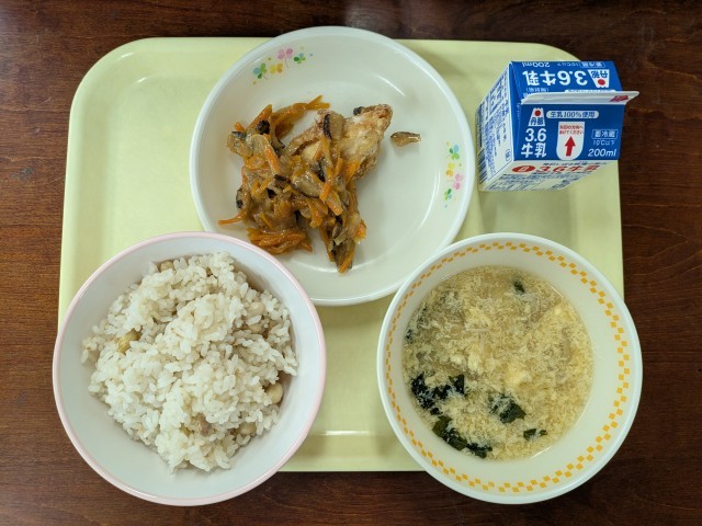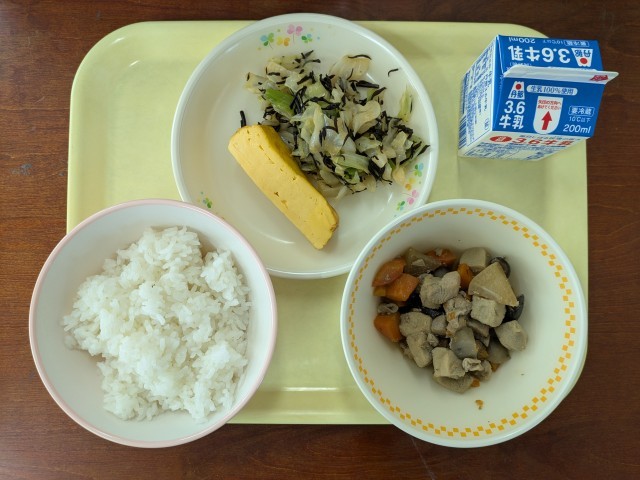 本日の給食は、ごはん、牛乳、とり肉とジャガイモの揚げ煮、わかめスープです。