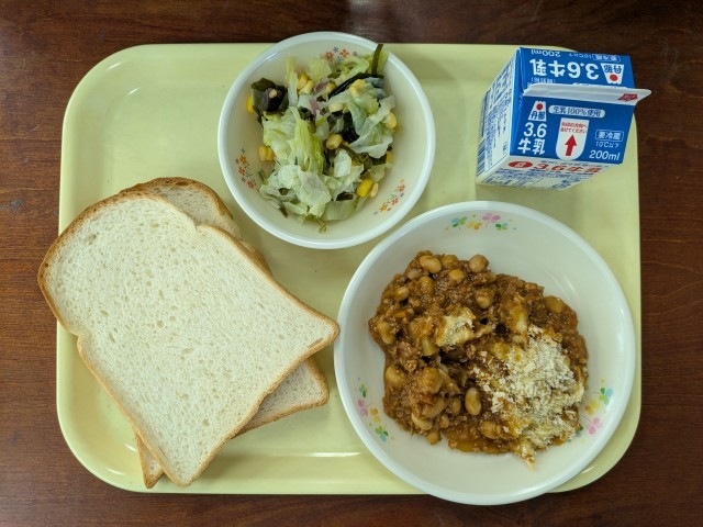 本日の給食は、食パン、牛乳、まめまめグラタン、海藻サラダです。