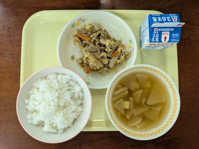 本日の給食は、ごはん、牛乳、豚肉の卵とじ、豆腐と大根のすまし汁です。