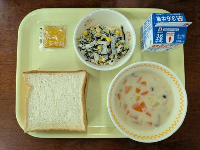 本日の給食は、食パン・りんごジャム、牛乳、きのこチャウダー、ひじき入りサラダです。