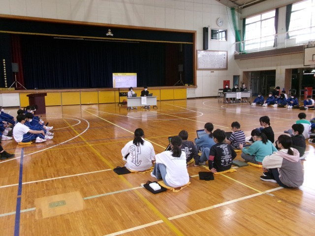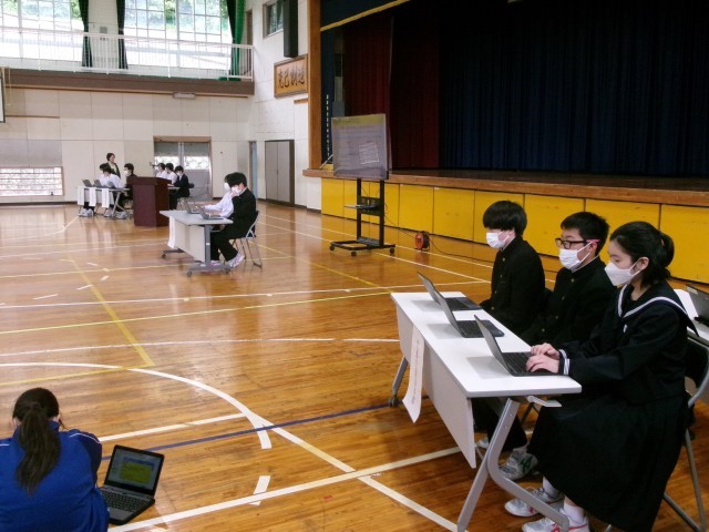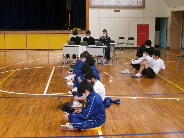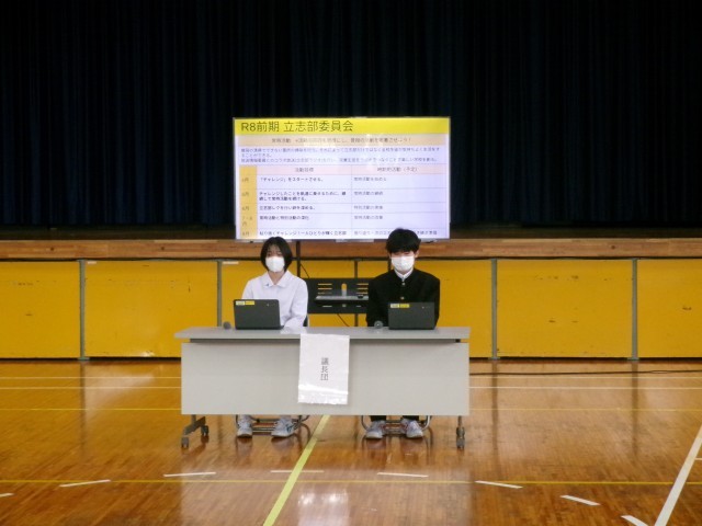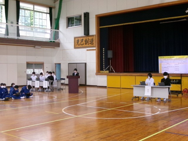 昼休みに「生徒総会」が行われ、本部、各委員会、志部委員会から活動の計画が出されました。