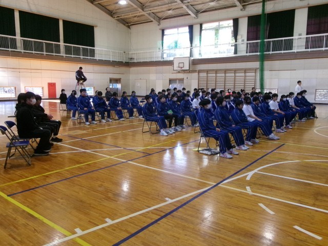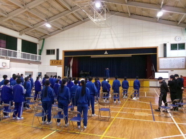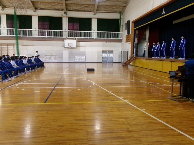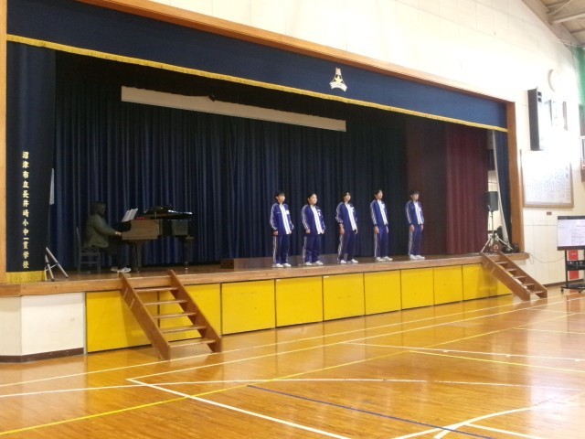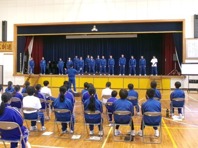 全校児童・生徒が集まり、金曜日に予定されている音楽発表会のリハーサルを行いました。
