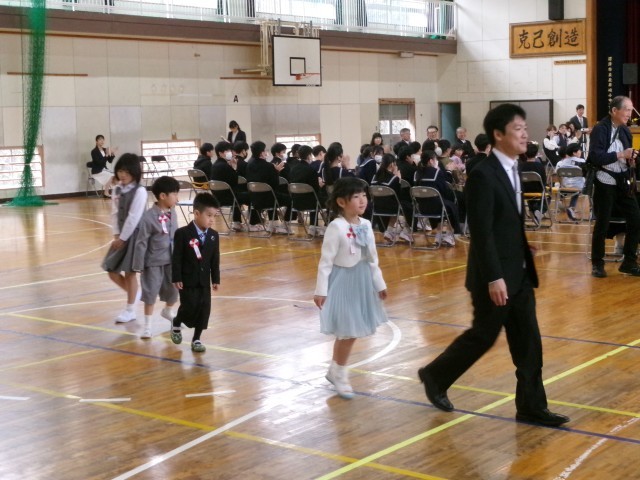 9年生に手を引かれた1年生が入場して、入学式が始まりました。