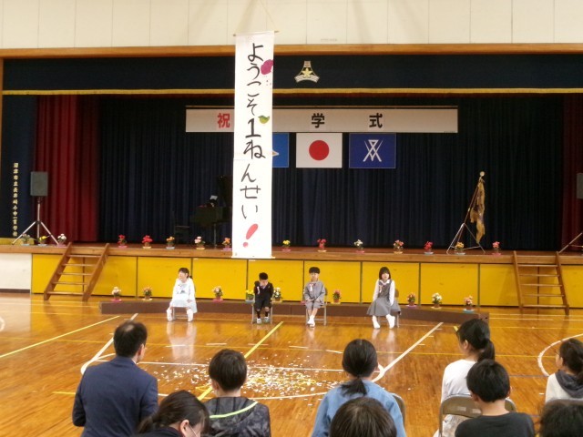代表のあいさつ、6年生からの歓迎の言葉、校歌、くす玉割りで1年生を迎えました。