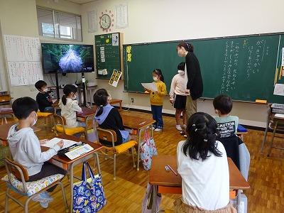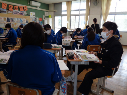 教科書の英文を読んで一文ずつ意味を確認しています。学習問題について文章の表現をもとに考えを出し合っています。