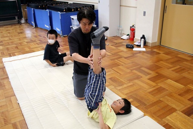 3・4年生の体育では、マット運動を行っています。先生の見本を見てから、みんなで「背支持倒立」に挑戦!先生のサポートを受けながら、キレイな背支持倒立をすることができました。