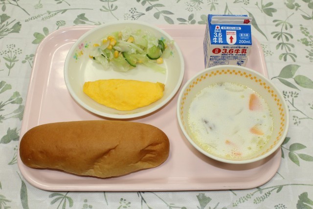 今日の給食は、「黒糖いりロールパン」「きのこのクリームシチュー」「オムレツ」「ボイルドサラダ」「牛乳」です。きのこシチューには、ぶなしめじとマッシュルームの2種類のきのこがたくさん入っており、秋の実りを感じることができました。黒糖入りロールパンは、黒糖のほんのりとした甘みにふんわりとした食感を楽しむことができました。
