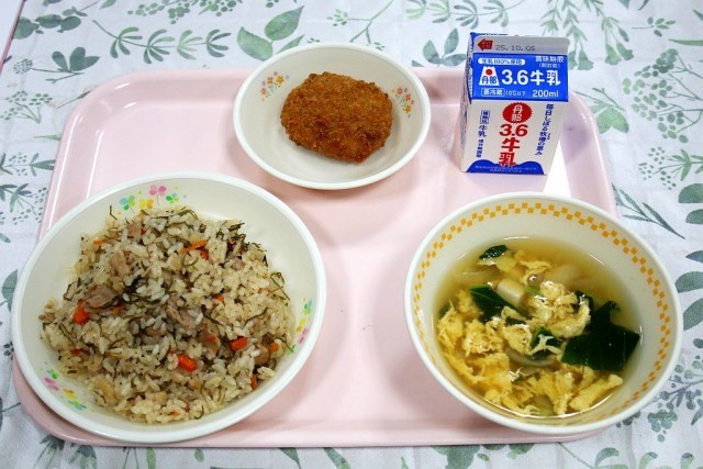 今日の給食は、「クーブジューシー」「メンチカツ」「卵と豆腐のスープ」「牛乳」です。クーブジューシーは沖縄の郷土料理です。沖縄の言葉でクーブは「昆布」、ジューシーは「味のついたご飯(炊き込みご飯や雑炊など)」を指すそうです。味付けがよく、糸昆布がアクセントとなり、とても美味しかったです。メンチカツは、揚げ方・味付けが抜群で、お店で提供されているようでした。子供たちも喜んでいただいたと思います。
