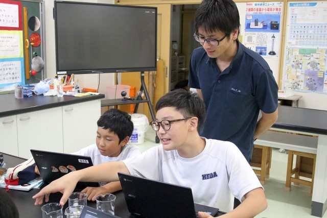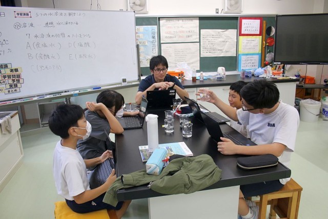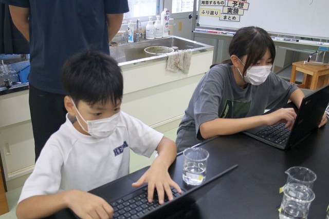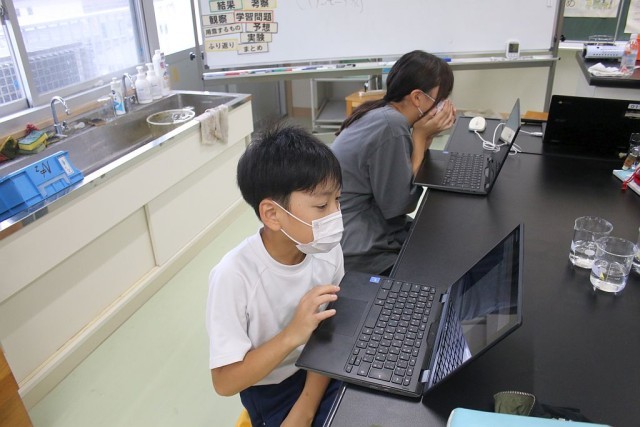 6年生の理科では、「5つの水溶液を観察しよう」を学習課題として授業が進められています。5つとは、食塩水、塩酸、炭酸水、石灰水、アンモニア水のことで、それぞれの水溶液を観察し、Chromebookで性質ノートをつくっていきます。「アンモニアが臭い臭い」とみんな鼻を覆っていました。