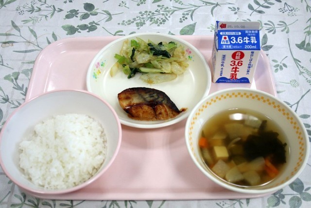 今日の給食は、「ご飯」「鯖の味噌焼き」「からし和え」「すまし汁」「牛乳」です。鯖の味噌焼きは、皮はパリパリ、身はふんわりで味付けがしっかりしているのでとても美味しかったです。すまし汁は、根菜や豆腐のちょうどよい食感と出汁が利いているので、とても美味しかったです。