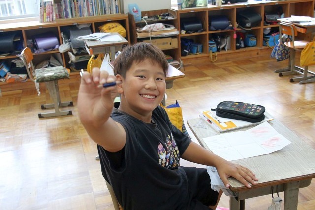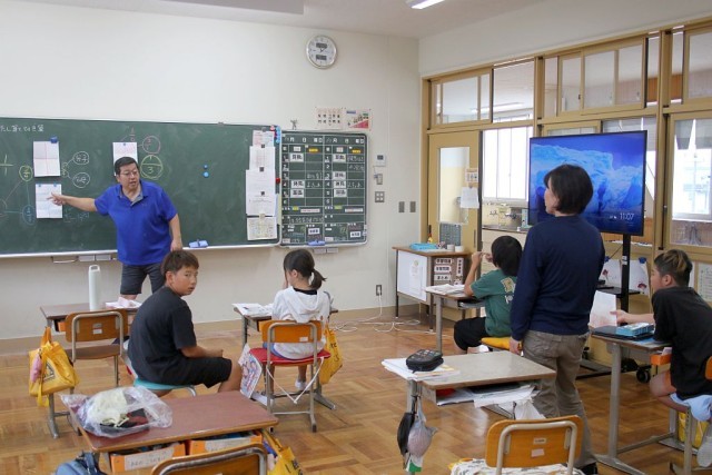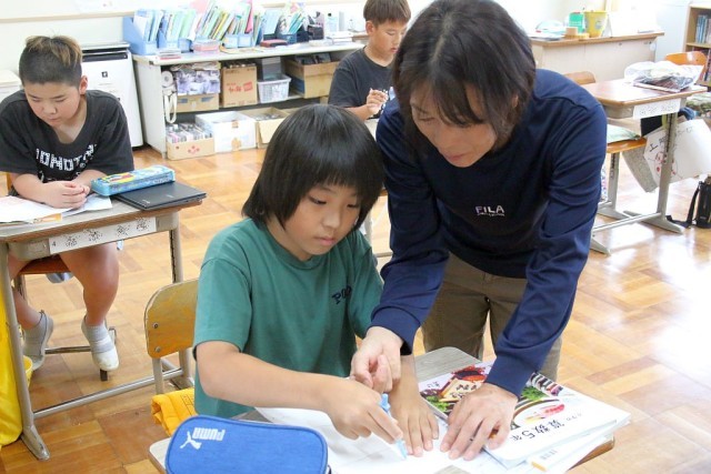 5年生の算数では、「分数の足し算・引き算」について授業が進められています。児童たちは、プリントのマスを塗りながら、分数について学んでいます。