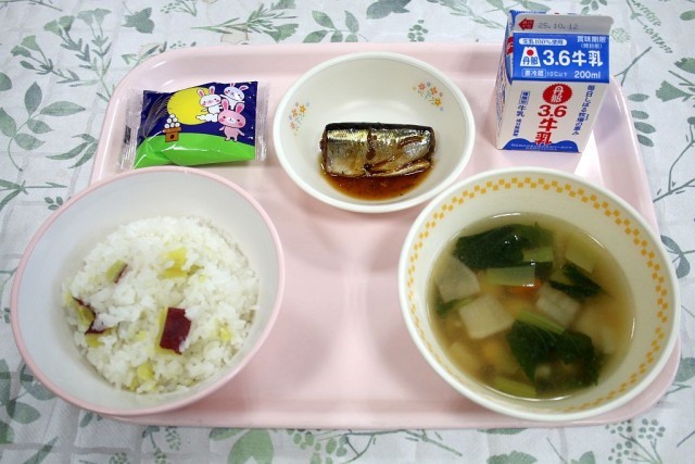 今日の給食は、お月見給食です。メニューは、「さつまいもご飯」「サンマの煮付け」「白玉汁」「お月見大福」「牛乳」です。さつまいもご飯は、お芋がホクホクで、秋を感じながら美味しくいただきました。白玉汁は、白玉がフワフワで、出汁も利いていて、とても美味しかったです。お月見大福は、子供たちみんな喜んで食べていました。