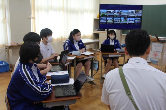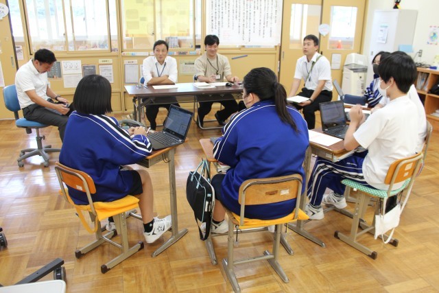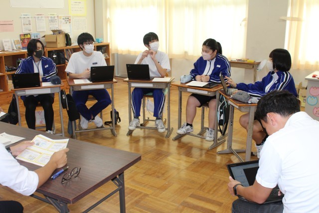 9年生は5・6時間目に総合的な学習の時間で、沼津市役所職員の方々と交流しました。9年生はこれまで、「未来へつなぐ戸田~子どもたちが住み続けたいまちにするために~」というテーマで戸田の現状を調査し、どうすれば戸田の人口減少を止められるかという課題に取り組んできました。今日は自分たちの考えた解決策をプレゼンし、まちづくり政策課と政策企画課で活躍されている職員の方々にアドバイスをいただきました。