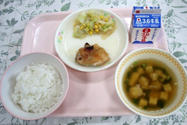 今日の給食は、「ご飯」「鶏肉の味噌焼き」「こんにゃくサラダ」「たらのつみれ汁」「牛乳」です。鶏肉の味噌焼きは、しっかり焼かれていても身は軟らかくジューシーで大変美味しかったです。たらのつみれ汁は、魚の出汁が出ていて、味付けもちょうど良く、こちらも大変美味しかったです。