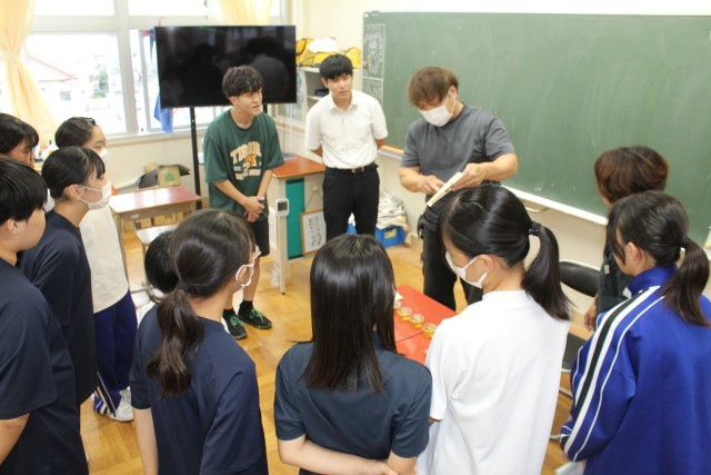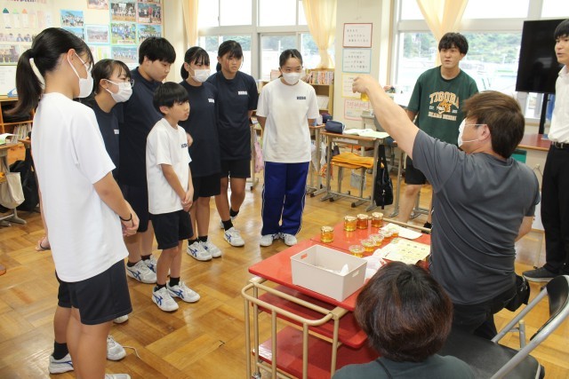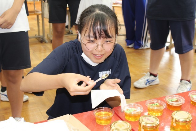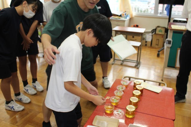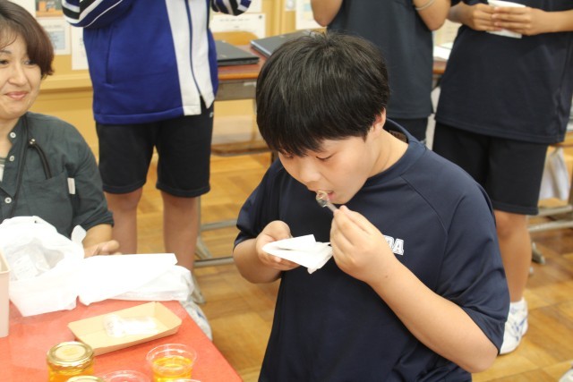 7年生は、2月4日(水)の原村交流の際に物品販売を行う予定です。その時に、戸田の特産品として販売予定のハチミツについて勉強しました。ハチミツを製造・販売している髙竜養蜂場の方々にお越しいただき、ハチミツの製法や花による味の違いなどについてお話しいただきました。特に「アブラギリ」と「タチバナ」は日本で戸田でしか製造していないということを聞き、7年生は大変驚いていました。最後に5種類のハチミツを試食させていただきました。味や香りの違い分かりましたか?