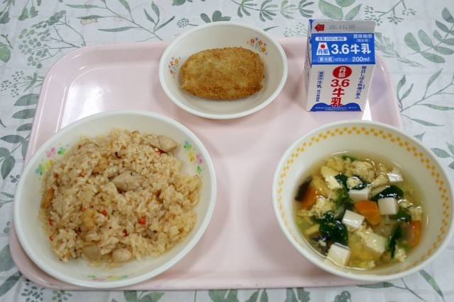 今日の給食は、「ナシゴレン」「野菜コロッケ」「卵と野菜のスープ」「牛乳」です。ナシゴレンはインドネシア発祥の米料理で、「ナシ」は「ごはん」、「ゴレン」は「炒める、揚げる」という意味だそうです。インドネシア風チャーハンやマレーシア風チャーハンなどと呼ばれることもあるとか…。今日の給食も大変美味しかったです。