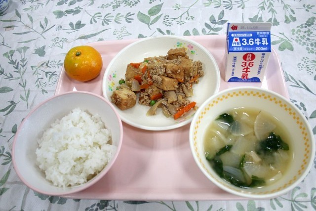 今日の給食は、「ご飯」「厚揚げのそぼろに」「さつまいもと大根の味噌汁」「みかん」「牛乳」です。厚揚げのそぼろは、厚揚げ豆腐に味がしっかり染みこんでいて、豚肉やしいたけ、グリンピースなどと相まって、とても美味しかったです。味噌汁は、味付けとさつまいも&大根の食感がよかったです。みかんは、初等部の子供たちはみんな大喜びでした。