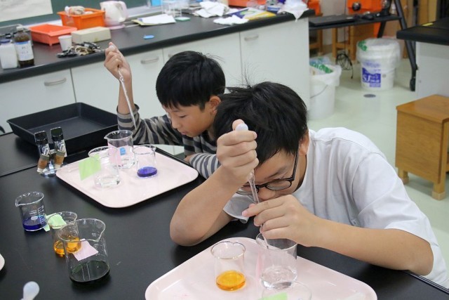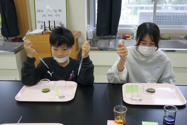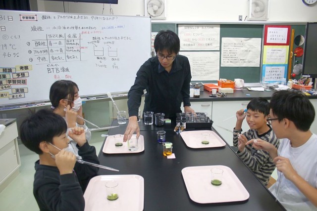 6年生の理科では、「酸性とアルカリ性を混ぜると、中性になるのか」を学習問題として授業が進められています。児童たちは各自実験を行い、色が変わる瞬間を目の当たりにして、「お~」と声を上げていました。
