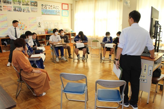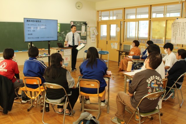 9年生と保護者対象の進路説明会が開催されました。あと2ヶ月ほどで私立高校のWeb出願が始まり、9年生としては進路選択という大きな決断を迫られる時期となりました。校長挨拶では志望校をどこにするのかだけが進路指導ではなく、将来どのような職業に就きたいのか、どのような人生を歩みたいのかということまで含めてが進路指導であることや保護者との対話の重要性が語られました。また、進路指導主事からは受験当日までの日程や出願方法、選抜の仕組みなどが具体的に説明されました。