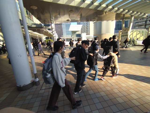 品川駅に無事到着しました。品川駅は広いので、迷子にならないように前の人のリュックをつかみながら歩きます。ジャンボタクシーに乗り換え、いざ!ANA機体工場へ!
