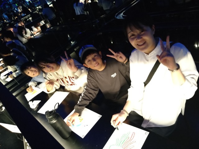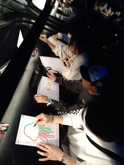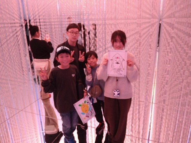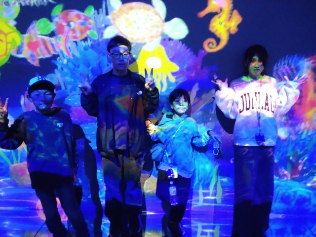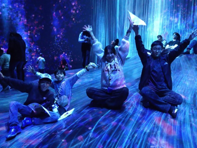 EPSONチームラボボーダレスを見学しました。このミュージアムは、最新テクノロジーを駆使した没入型アートミュージアムです。壁や境界線のないの空間で、自分の描いた魚が泳ぎ出したり、自分の動きに合わせてデジタルアートが変化したりするので、皆驚いていました。デジタルアートの美しさに感動しながら、様々なアートに触れることができました。