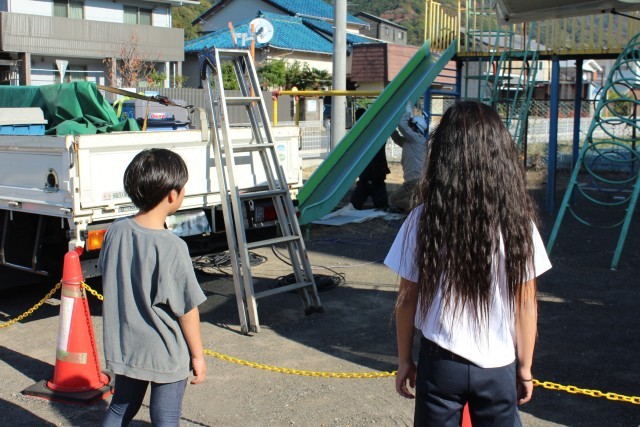 今日から、総合遊具の修理が始まりました。早く修理が完了し、遊べるようになるのが待ち遠しいですね。