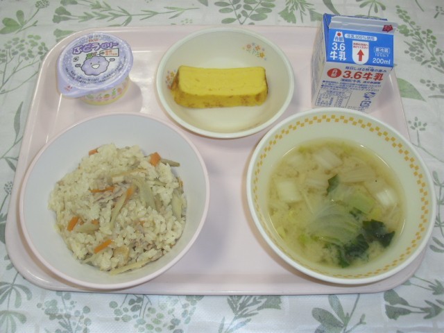 今日の献立は、「豚肉の炊き込みご飯」「厚焼きたまご」「豆腐と白菜のみそ汁」「ぶどうゼリー」です。炊き込みご飯には、細かく刻んだ豚肉・油あげ・人参・ゴボウが具材としてたくさん使用されており、出汁が染みていてとてもおいしかったです。厚焼きたまごはほのかな甘みがあり、ふわっとした食感が面白かったです。豆腐と白菜のみそ汁には、豆腐と白菜だけでなく小松菜や玉葱、ぶなしめじが使われており栄養のバランスがとれていました。ぶどうゼリーは食後のデザートとして口のなかがさっぱりしました。
