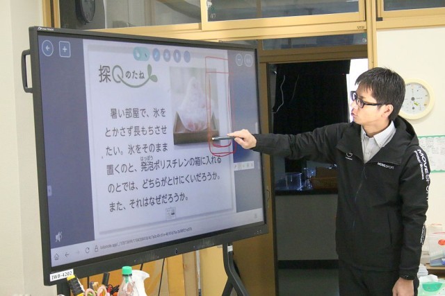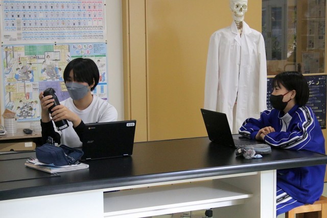 9年生の理科では、「熱はどのように伝わるのだろうか?」を学習問題として授業が進められています。熱が逃げにくい構造をしている水筒を例に、先生からの「どうして熱が逃げにくいの?」という発問に対して、生徒たちは自分の考えをしっかり述べていました。