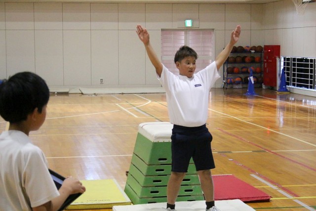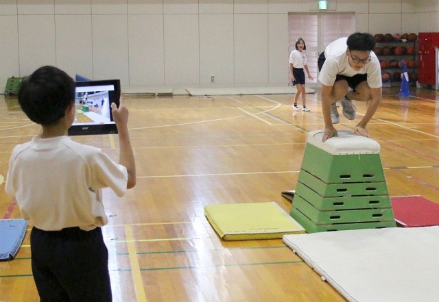 12/1(月)5・6年生 体育 【戸田小中】 公開日 2025/12/01 更新日 2025/12/01 N-GIGA 5・6年生の体育では、器械運動「跳び箱」を行っています。開脚跳びや抱え込み跳び、台上前転を行っているところをバディに動画撮影をしてもらっています。撮ってもらった動画を自分で確認しながら、動きを修正し、成功するまで挑戦していました。技を上手に披露できている児童が何人もいました。 +3 N-GIGA