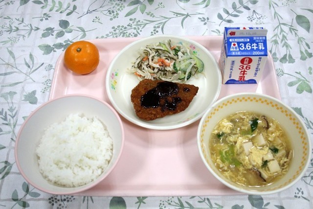 今日の給食は、「ご飯」「ぶりフライ」「切り干し大根の和え物」「かき玉汁」「みかん」「牛乳」です。ぶりフライは、外がカリカリで美味しくいただきました。切り干し大根の和え物は、切り干し大根・もやし・きゅうりなどに和風ドレッシングがピッタリ合い、とても美味しかったです。かき玉汁は、たくさんの卵・松菜・しいたけが入っていて、美味しい出汁と相まって、こちらも大変美味しかったです。