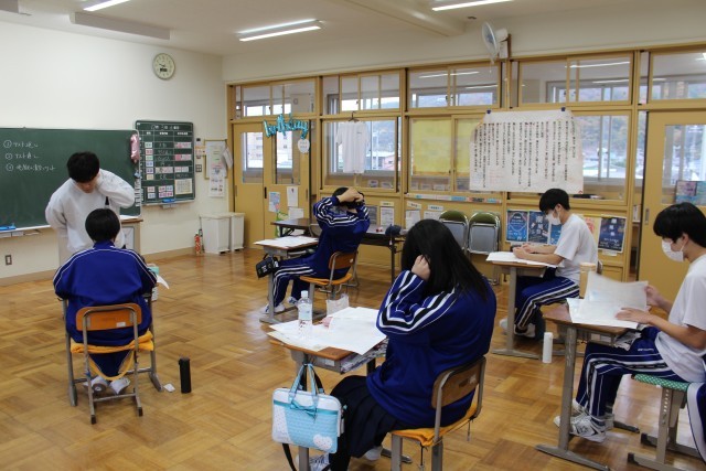 9年生の国語では、先日行われた学力診断調査の返却・問題の解説が行われました。先生が「理由をきかれたら、文末は『から』「気持ちをきかれたら、文末は『気持ち』という文末にすること。」と言うと、「気をつけていればもっと得点がとれたのにぃ~」という後悔の声がきかれました。