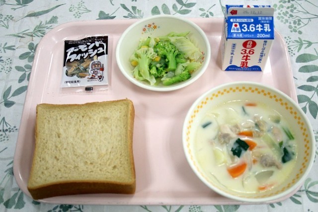 今日の給食は、「黒糖食パン」「白インゲン豆のクリームシチュー」「カリフローレと野菜のソテー」「アーモンド小魚」「牛乳」です。クリームシチューは、インゲン豆・ジャガイモ・にんじん・鶏肉などがしっかり煮込まれいて、体がポカポカ♪大変美味しかったです。カリフローレと野菜のソテーは、洋出汁、塩こしょうが利いていて、とても美味しかったです。