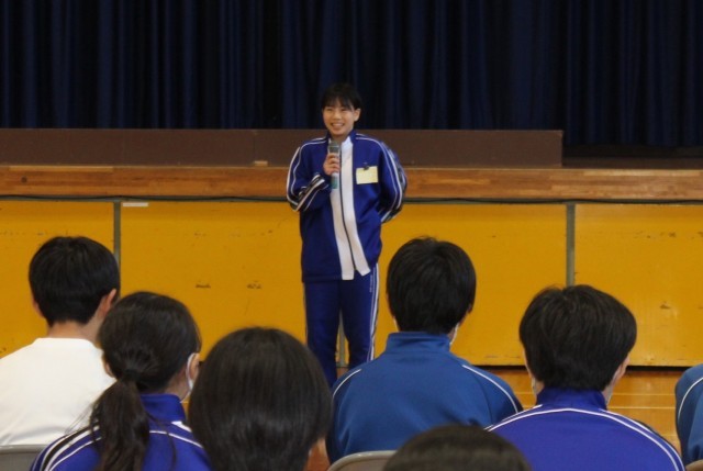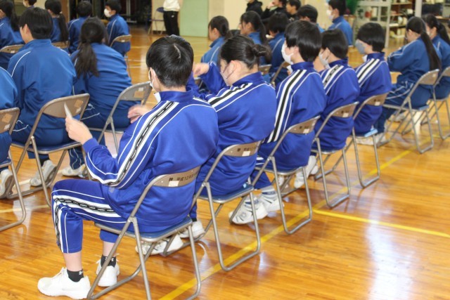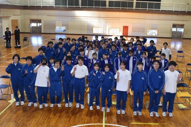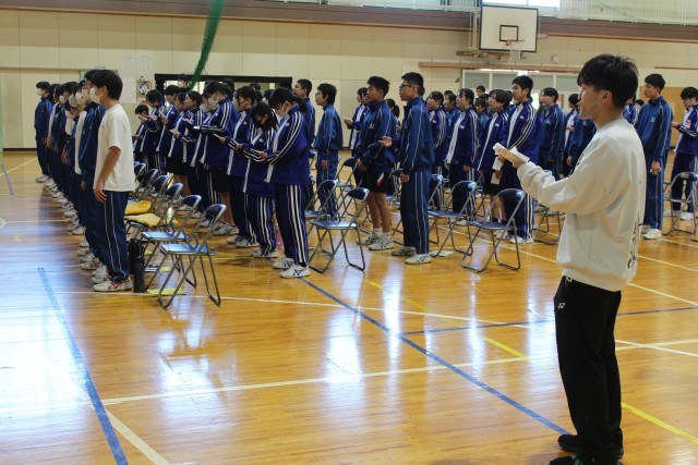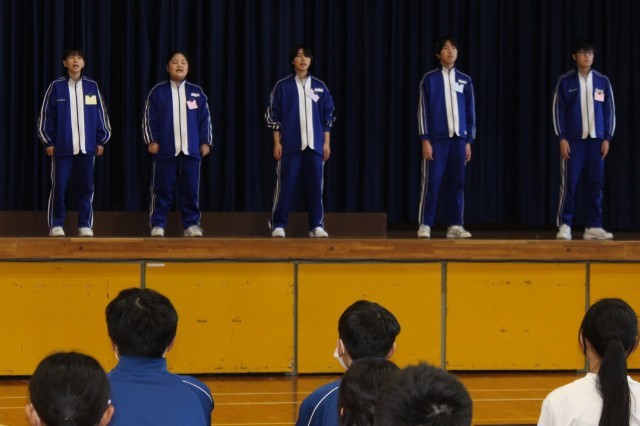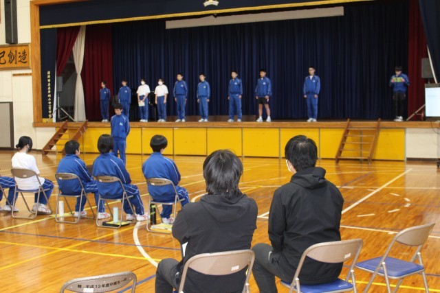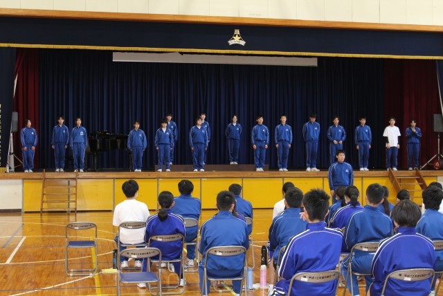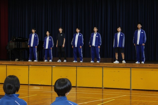 12/5(金)7~9年生 長井崎小中との合同リレー会③ 公開日 2025/12/05 更新日 2025/12/05 学校行事 昼食後は、体育館に移動して交歓合唱会を行ないました。この日のために練習してきた曲をお互い披露しあいました。8年生は序盤、緊張のためかやや声が出ていませんでしたが、9年生が座席から指揮をして応援した効果もあり徐々に盛り返して後半はいつも通りの歌唱ができました。最後は、会場にいる全員で「ふるさと」を合唱し一体感が生まれました。 +5 学校行事