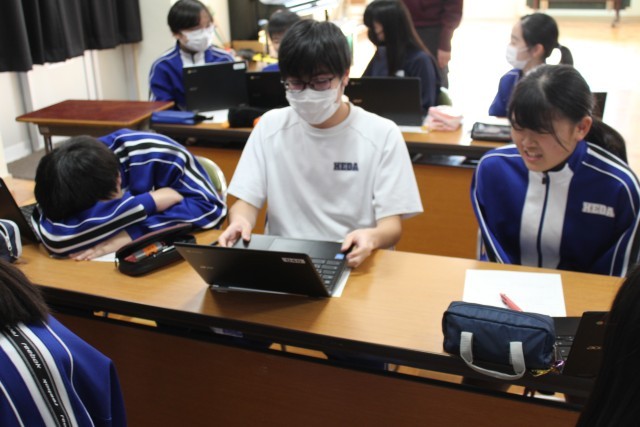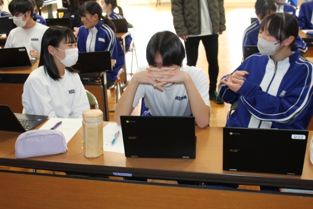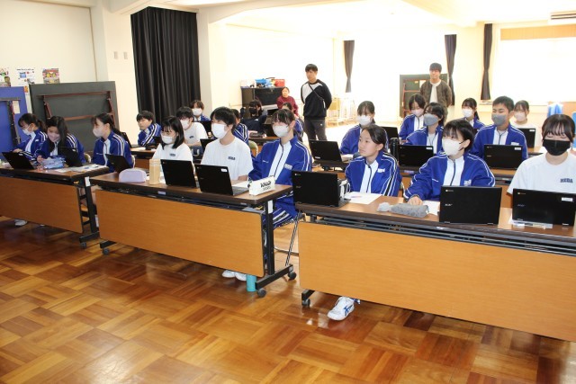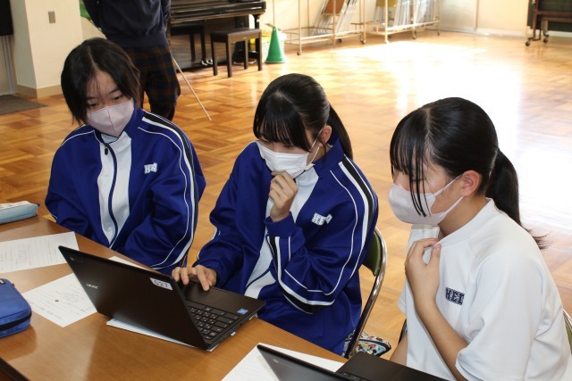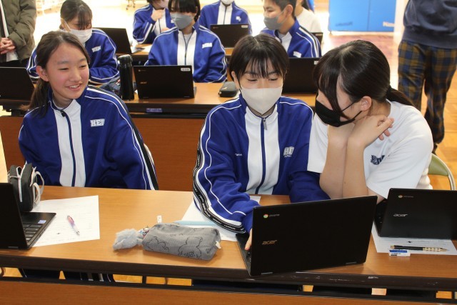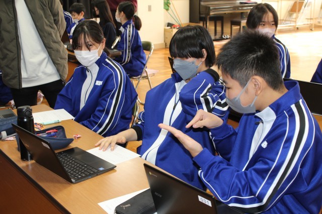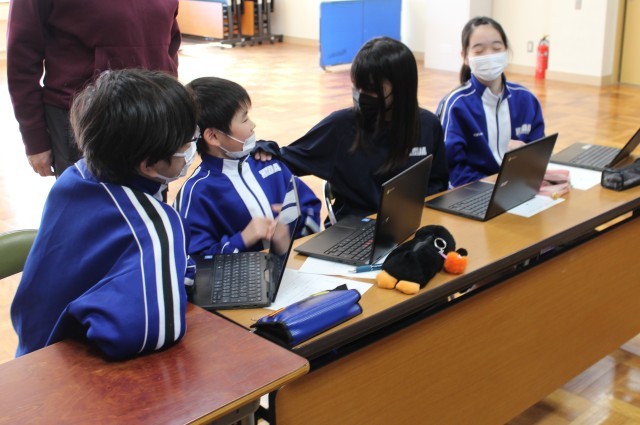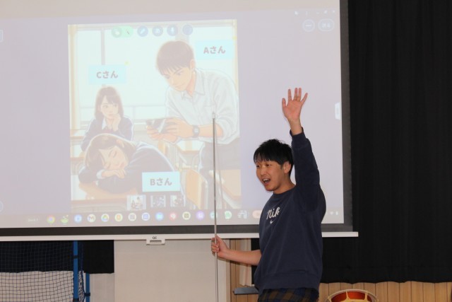 7~9年生は、4時間目にネットモラルについて合同道徳を行ないました。「SNSへの無断投稿」「グループチャットでのいじめ・悪口」「危険なメッセージへの対応」という、トラブルの多い3つのシチュエーションについてロールプレイを通じて考えました。「潜んでいる危険性は何か?」「どうしてそのような行為をするのか?」「どうすれば対処できるのか?」などについて、与えられた役割を演じることで自分事として考えることができるようになりました。