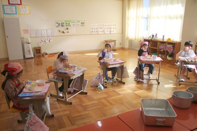 1年生は、給食の支度も早くでき、大好きなカレーライスを黙ってモグモグ…。今日はいつもより口数が少なかったのは美味しいカレーライスのせいかな?