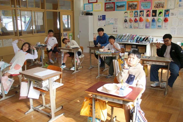 5・6年生の給食の様子です。既に半分の児童が食べ終わっていましたが、席に着いてもらって一緒にパチリ☆みんな元気です。担任の先生は放送委員会の仕事で放送室でした。